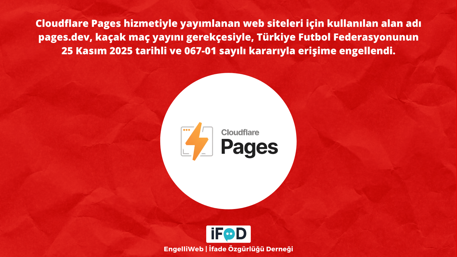 Cloudflare Pages hizmetiyle yayımlanan web siteleri için kullanılan alan adı pages.dev, kaçak maç yayını gerekçesiyle, Türkiye Futbol Federasyonunun 25 Kasım 2025 tarihli ve 067-01 sayılı kararıyla erişime engellendi.