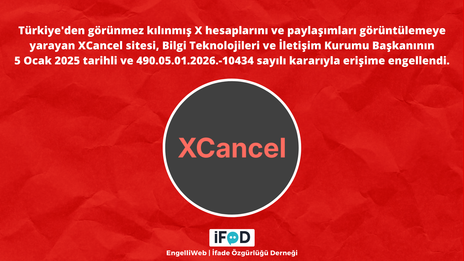 Türkiye’den görünmez kılınmış X hesaplarını ve paylaşımları görüntülemeye yarayan XCancel sitesi, Bilgi Teknolojileri ve İletişim Kurumu Başkanının 5 Ocak 2025 tarihli ve 490.05.01.2026.-10434 sayılı kararıyla erişime engellendi.