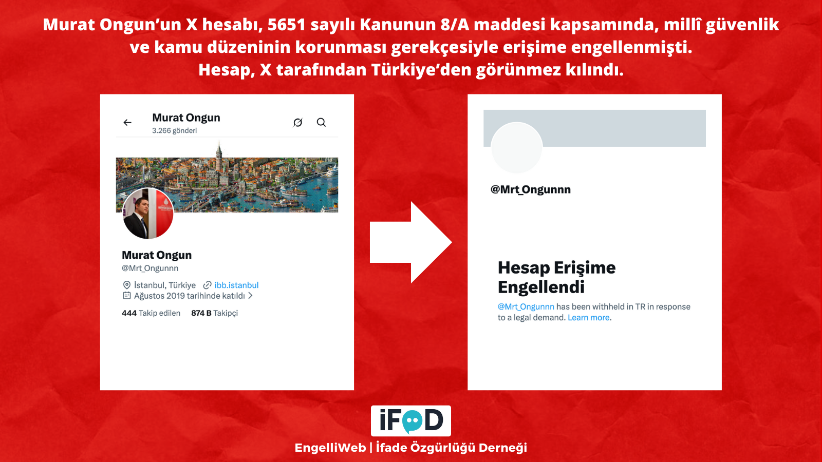 İstanbul Büyükşehir Belediyesi (İBB) soruşturması kapsamında tutuklu bulunan eski Medya A.Ş. Yönetim Kurulu Başkanı Murat Ongun‘un X hesabı (@Mrt_Ongun), 5651 sayılı Kanunun 8/A maddesi kapsamında, millî güvenlik ve kamu düzeninin korunması gerekçesiyle 2 Ocak 2026’da erişime engellenmişti. Hesap adı önce @Mrt_Ongunn ardından da @Mrt_Ongunnn şeklinde değiştirilmişti. X platformu, 874 bin takipçili hesabı 7 Ocak 2026‘da Türkiye’den görünmez kıldı.
