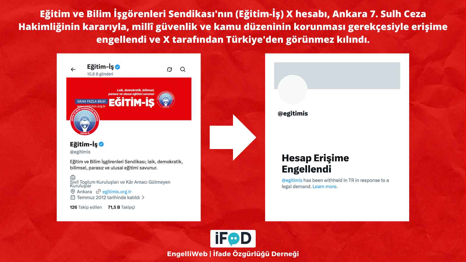 Eğitim ve Bilim İşgörenleri Sendikası‘nın (Eğitim-İş) X hesabı @egitimis, Ankara 7. Sulh Ceza Hakimliğinin kararıyla, millî güvenlik ve kamu düzeninin korunması gerekçesiyle erişime engellendi ve X tarafından Türkiye’den görünmez kılındı.
