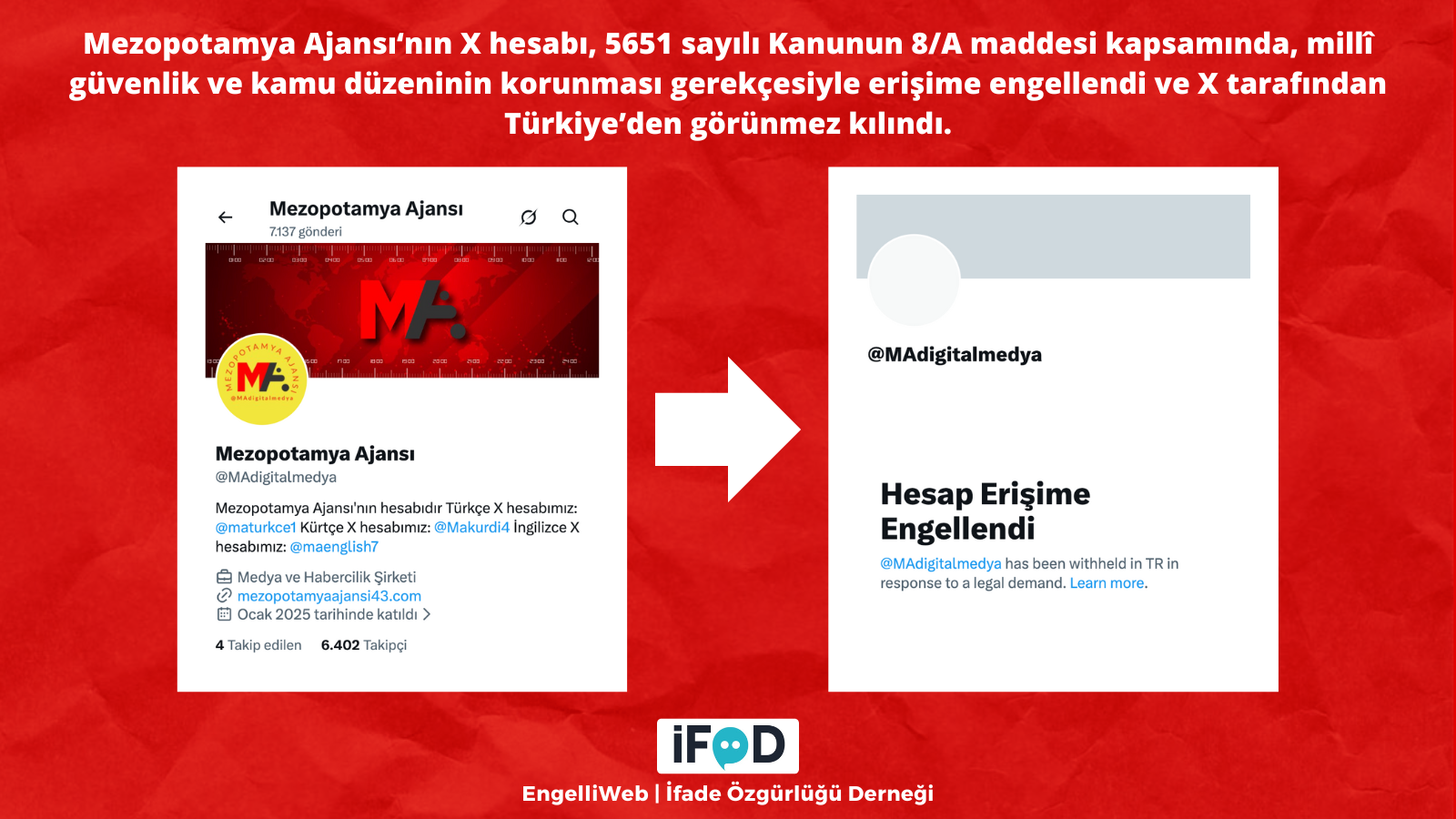 Mezopotamya Ajansı‘nın X hesabı, 5651 sayılı Kanunun 8/A maddesi kapsamında, millî güvenlik ve kamu düzeninin korunması gerekçesiyle erişime engellendi ve X tarafından Türkiye’den görünmez kılındı.