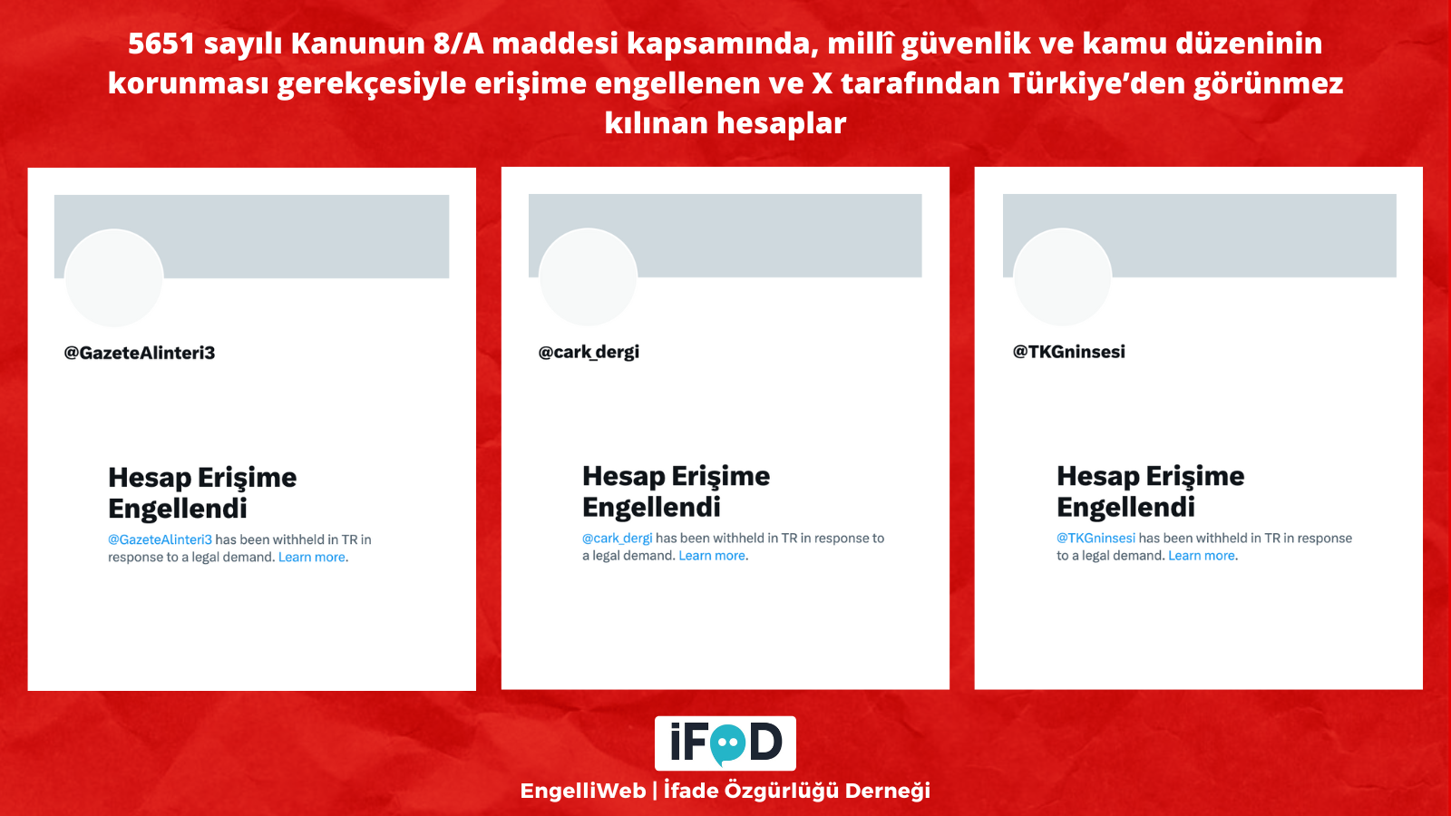 Alınteri Gazetesi, Çark Dergisi ve Türkiye Komünist Gençliği‘nin X hesapları, 5651 sayılı Kanunun 8/A maddesi kapsamında, millî güvenlik ve kamu düzeninin korunması gerekçesiyle erişime engellendi ve hesaplar X tarafından Türkiye’den görünmez kılındı.