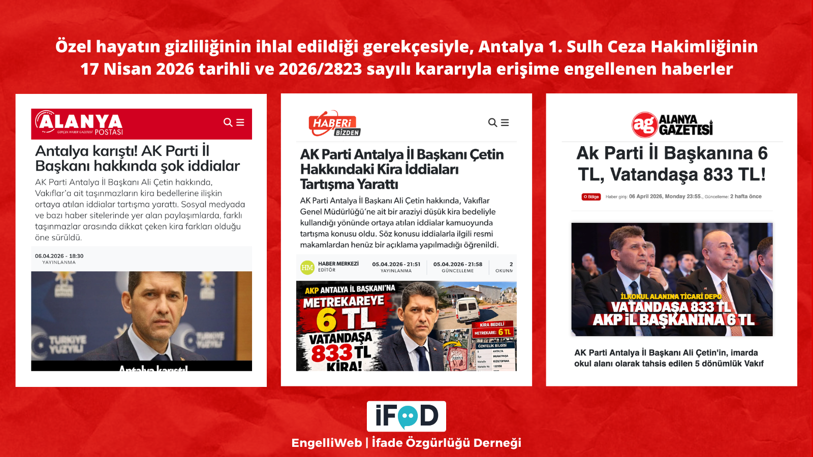 AKP Antalya İl Başkanı Ali Çetin’in, Vakıflar Genel Müdürlüğü’ne ait bir araziyi düşük kira bedeliyle kullandığı ve kullandığı öne sürülen taşınmazın, imar planında okul alanı olarak ayrılmasına rağmen farklı amaçlarla kullanıldığı iddialarına ilişkin haberler, özel hayatın gizliliğinin ihlal edildiği gerekçesiyle Antalya 1. Sulh Ceza Hakimliğinin 17 Nisan 2026 tarihli ve 2026/2823 sayılı kararıyla erişime engellendi.