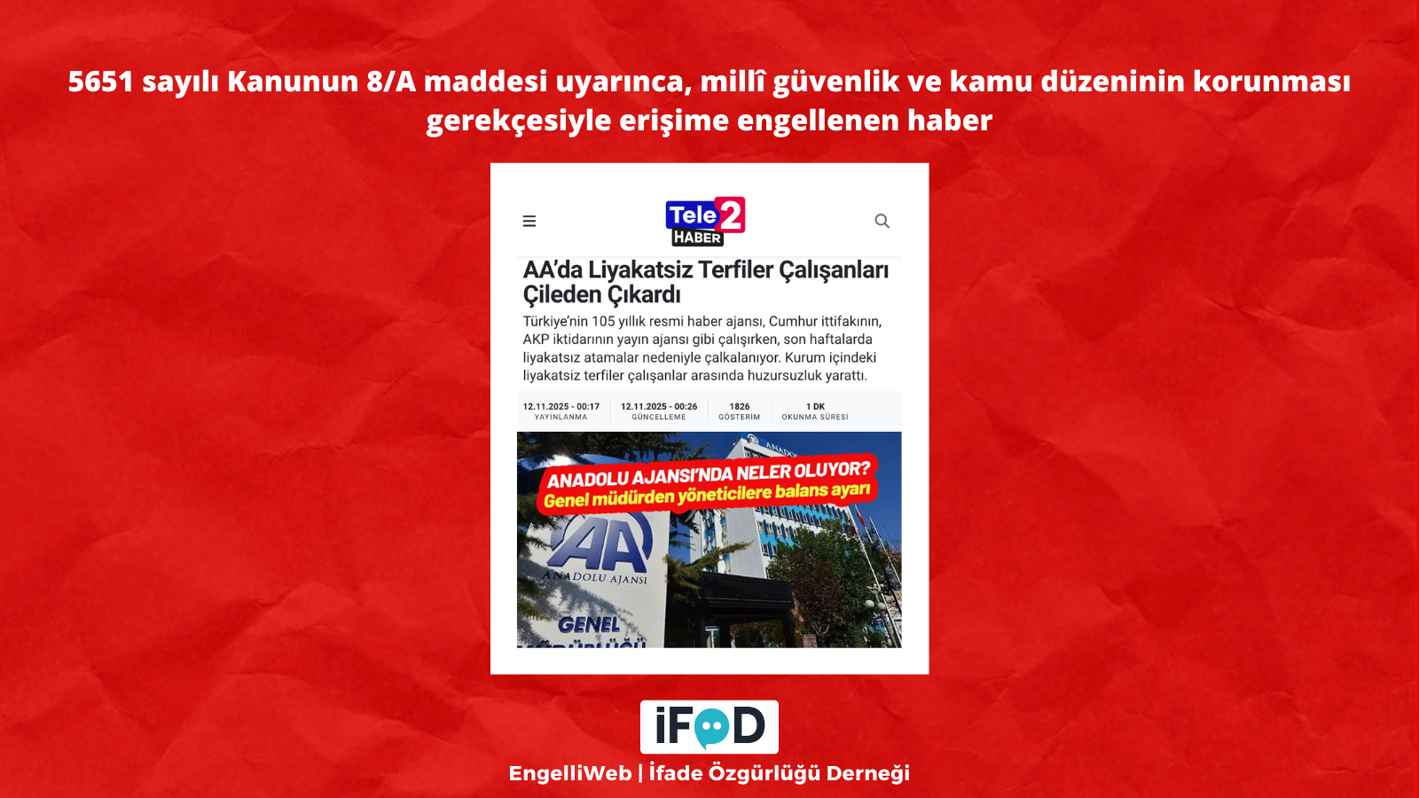 Anadolu Ajansı‘nda liyakatsız atamalar yapıldığı iddiasına ilişkin haber, 5651 sayılı Kanunun 8/A maddesi uyarınca, millî güvenlik ve kamu düzeninin korunması gerekçesiyle erişime engellendi.