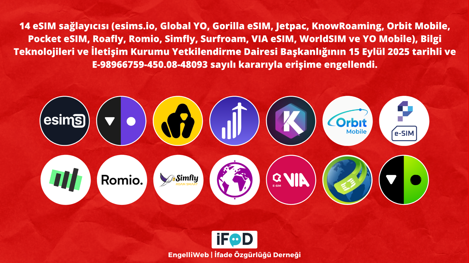 14 eSIM sağlayıcısının (esims.io, Global YO, Gorilla eSIM, Jetpac, KnowRoaming, Orbit Mobile, Pocket eSIM, Roafly, Romio, Simfly, Surfroam, VIA eSIM, WorldSIM ve YO Mobile) alan adları, Bilgi Teknolojileri ve İletişim Kurumu Yetkilendirme Dairesi Başkanlığının 15 Eylül 2025 tarihli ve E-98966759-450.08-48093 sayılı kararıyla erişime engellendi.