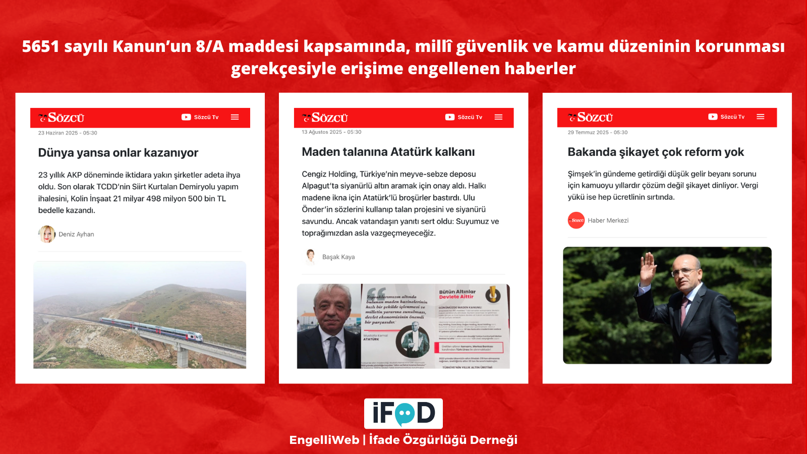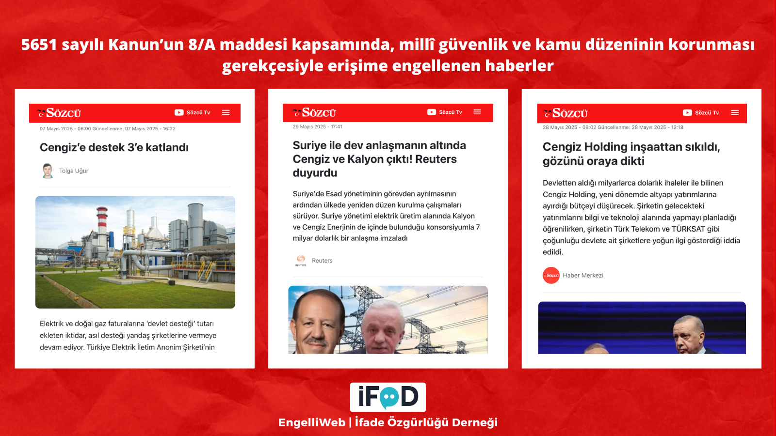 Cengiz Holding‘in adının geçtiği ve CHP milletvekillerinin açıklamalarının yer aldığı çeşitli haberler, 5651 sayılı Kanun’un 8/A maddesi kapsamında, millî güvenlik ve kamu düzeninin korunması gerekçesiyle erişime engellendi.