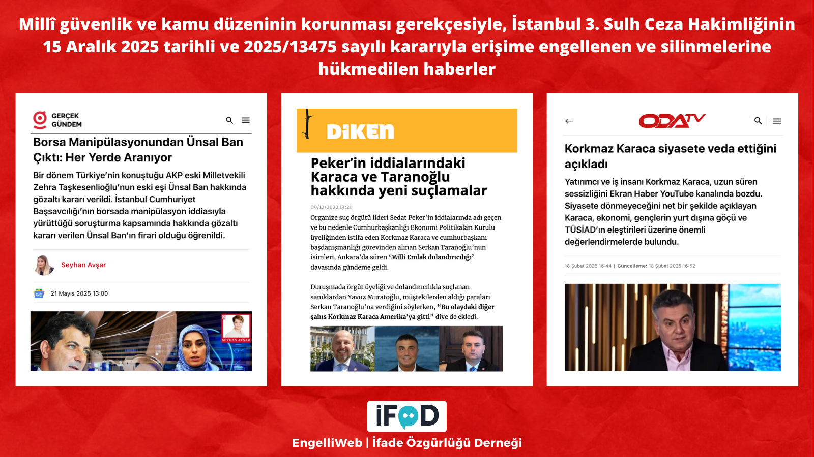 Korkmaz Karaca hakkındaki haberlere daha önce de İstanbul 9. Sulh Ceza Hakimliğinin 25 Kasım 2025 tarihli ve 2025/12856 sayılı kararıyla yaptırımlar uygulanmıştı.