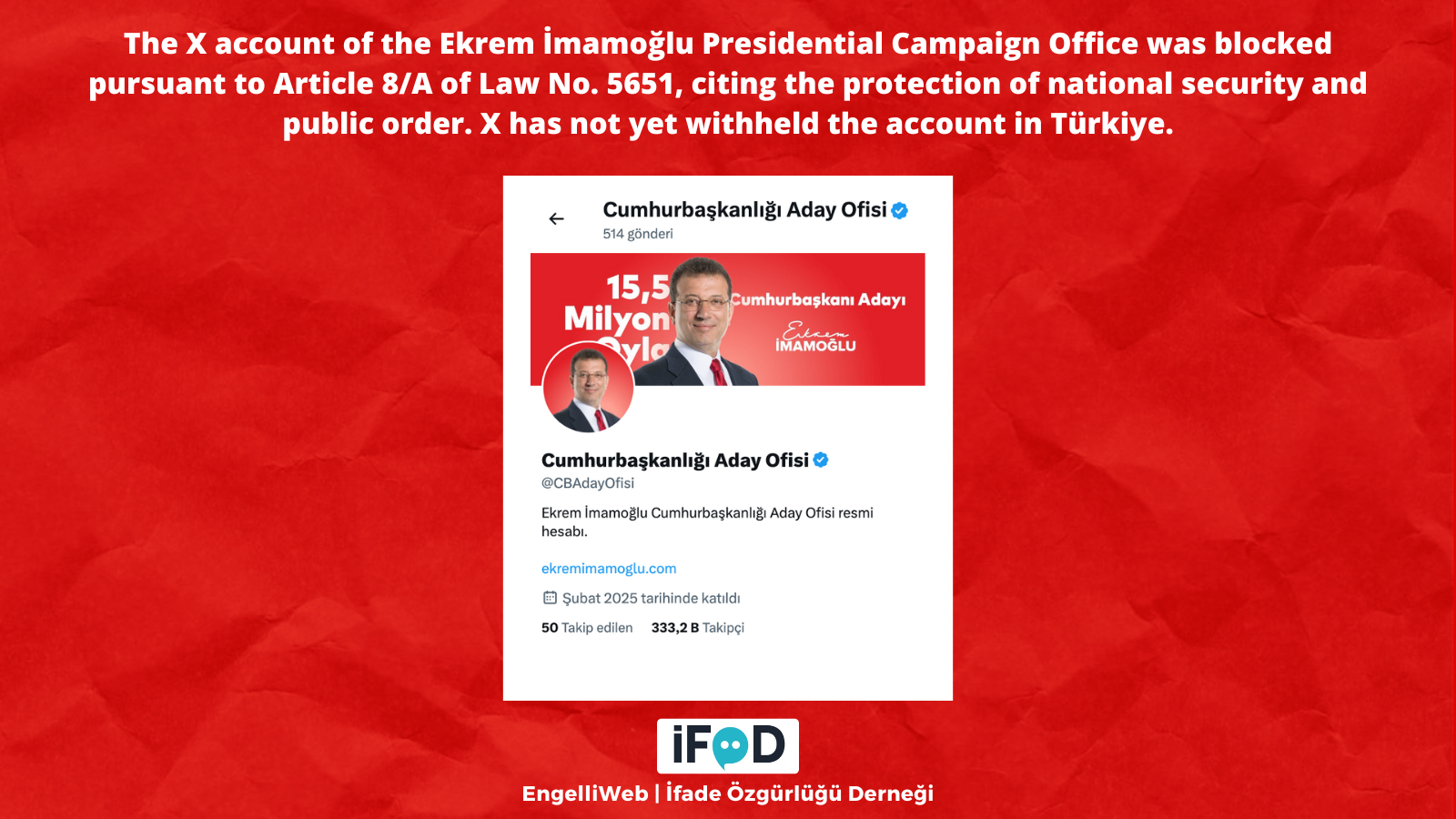 The X account of the Ekrem İmamoğlu Presidential Campaign Office was blocked pursuant to Article 8/A of Law No. 5651, citing the protection of national security and public order. X has not yet withheld the account in Türkiye.