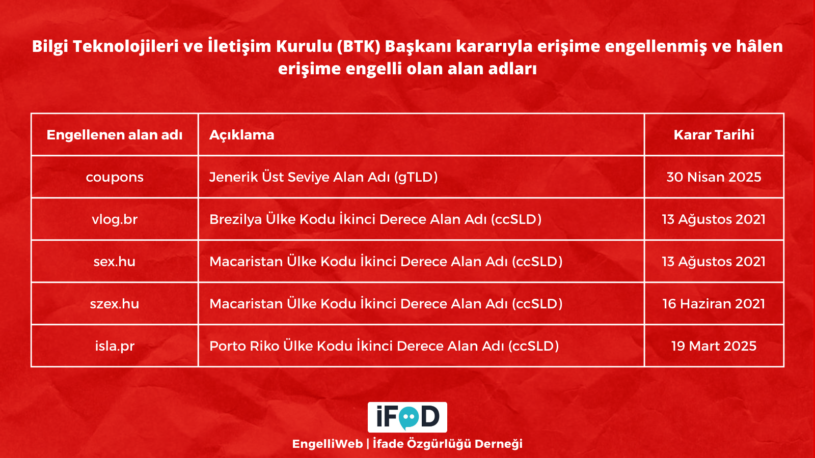 Bilgi Teknolojileri ve İletişim Kurulu (BTK) Başkanı kararıyla erişime engellenmiş ve hâlen erişimi engelli olan alan adları aşağıda listelenmiştir: