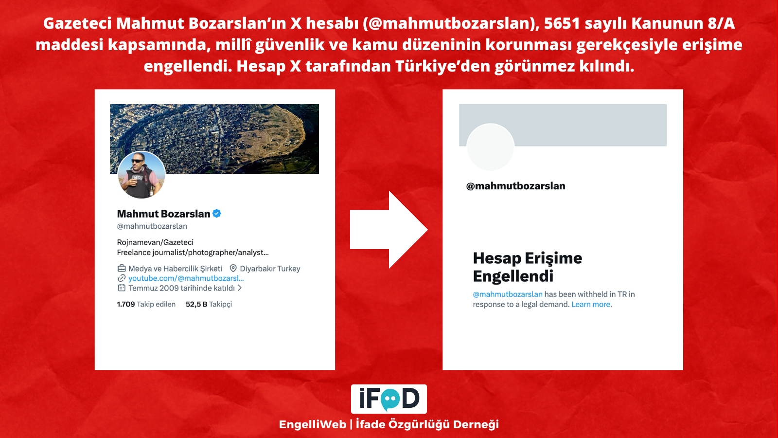 Gazeteci Mahmut Bozarslan‘ın (@mahmutbozarslan) X hesabı, 5651 sayılı Kanunun 8/A maddesi kapsamında, millî güvenlik ve kamu düzeninin korunması gerekçesiyle erişime engellendi. Hesap X tarafından Türkiye’den görünmez kılındı.