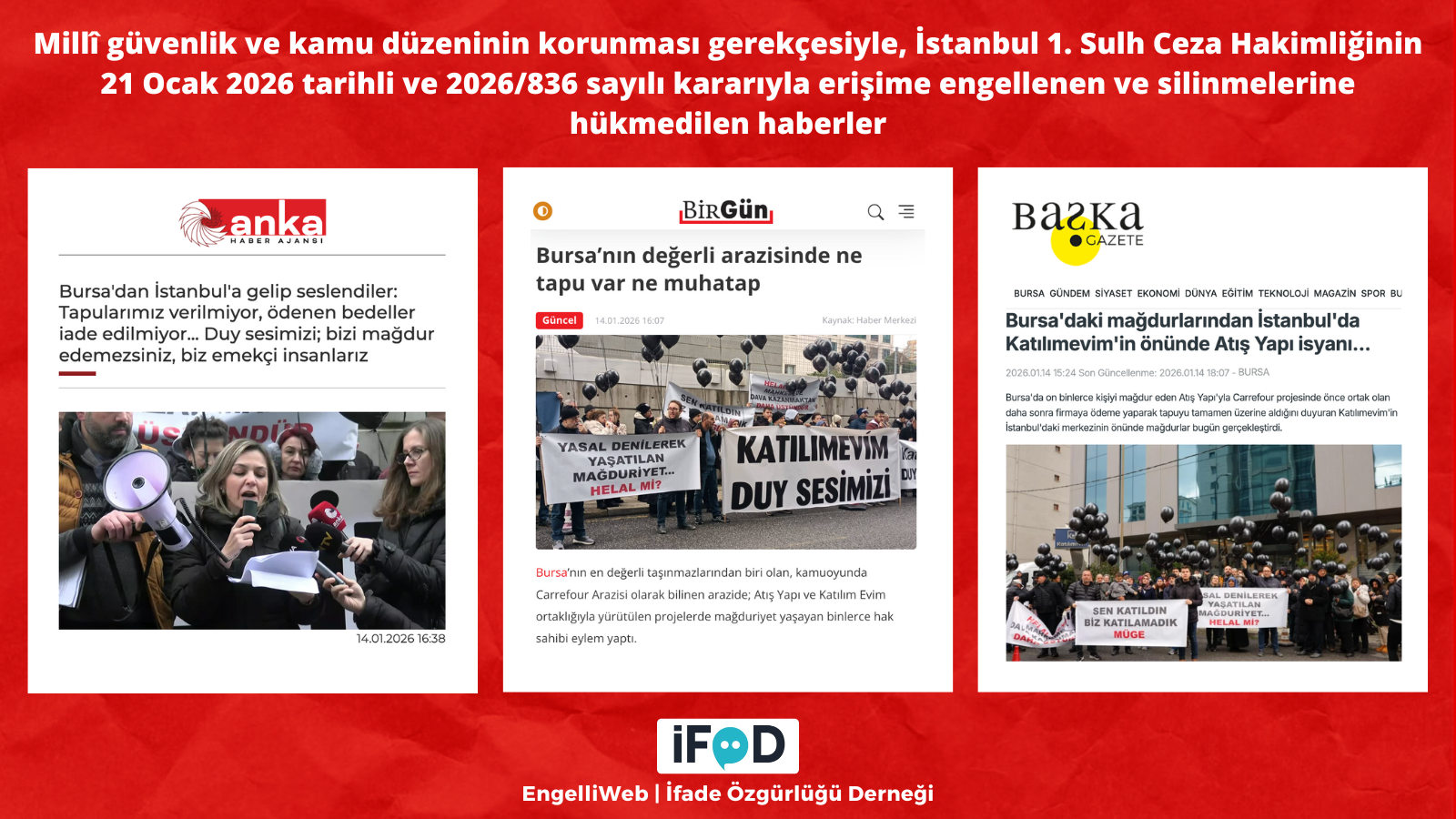 Bursa’daki “Carrefour Arazi”nde, Atış Yapı ve Katılımevim ortaklığıyla yürütülen projelerde mağduriyet yaşayanların Katılımevim Genel Merkezi önünde yaptıkları eylem hakkındaki haberler, millî güvenlik ve kamu düzeninin korunması gerekçesiyle, İstanbul 1. Sulh Ceza Hakimliğinin 21 Ocak 2026 tarihli ve 2026/836 sayılı kararıyla erişime engellendi ve silinmelerine hükmedildi.