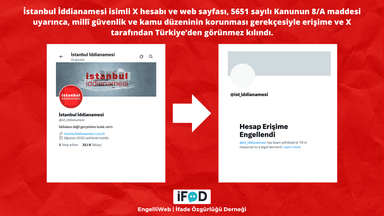 İstanbul Büyükşehir Belediyesi’ndeki (İBB) “yolsuzluk” iddialarıyla ilgili yürütülen soruşturma kapsamında İstanbul Cumhuriyet Başsavcılığı’nın hazırladığı iddianamenin ardından “İstanbul İddianamesi” adıyla açılan ve dosyada yer alan iddiaları ele alan (istanbuliddianamesi.com/tr) internet sitesi ve X hesabı (ist_iddianamesi), 5651 sayılı Kanunun 8/A maddesi uyarınca, millî güvenlik ve kamu düzeninin korunması gerekçesiyle erişime engellendi. Hesap, X tarafından Türkiye’den görünmez kılındı.