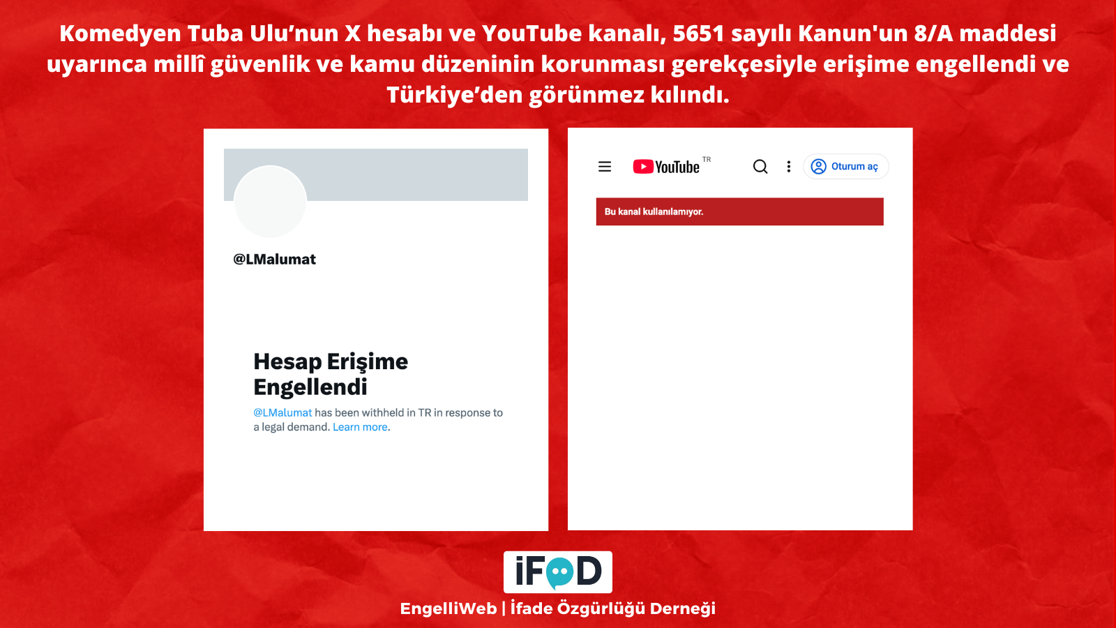 Stand-up gösterisindeki bir espri nedeniyle başlatılan soruşturma kapsamında gözaltına alınan komedyen Tuba Ulu’nun X hesabı ve YouTube kanalı, 5651 sayılı Kanun’un 8/A maddesi uyarınca millî güvenlik ve kamu düzeninin korunması gerekçesiyle erişime engellendi ve Türkiye’den görünmez kılındı.
