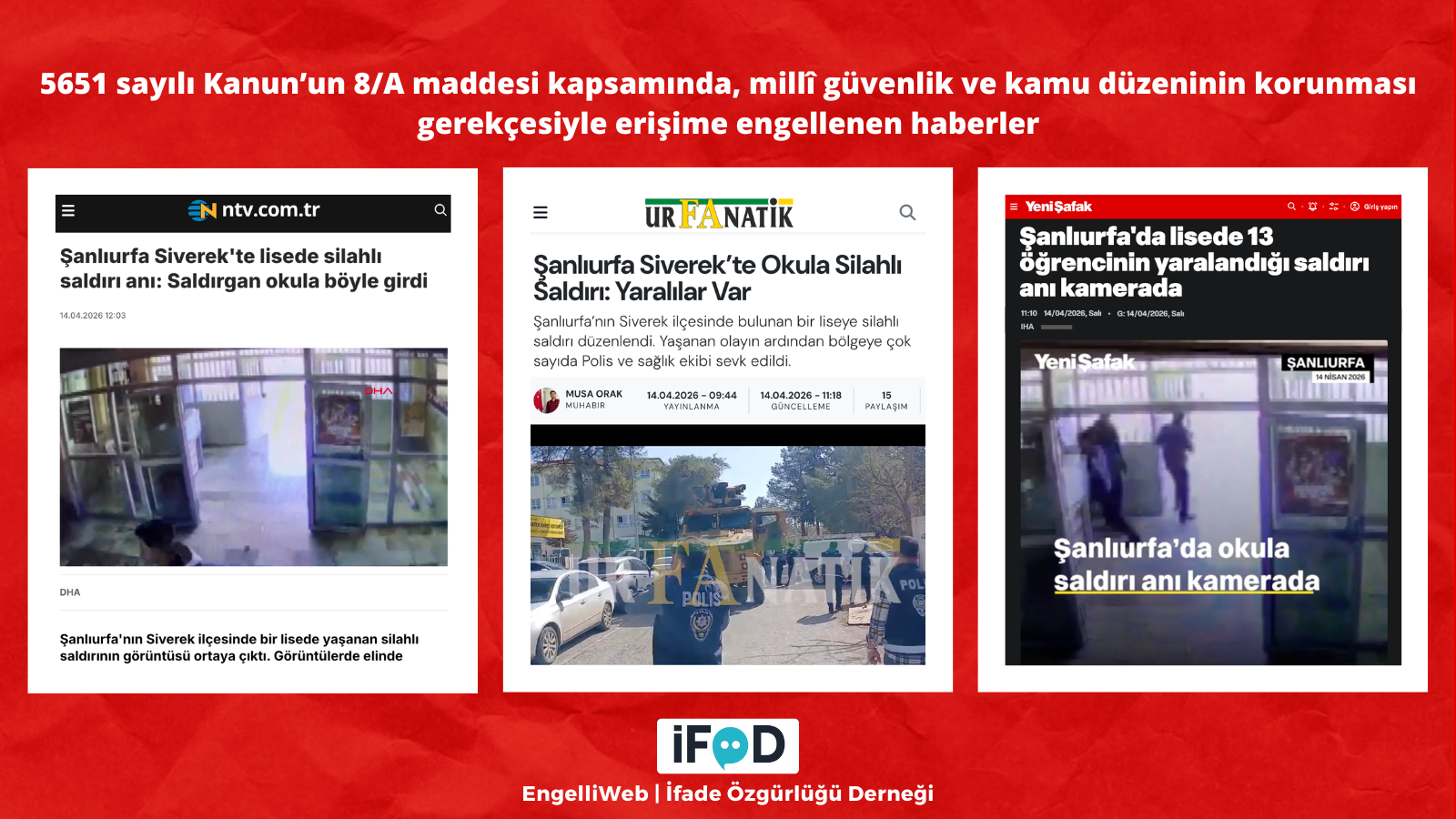 Şanlıurfa‘nın Siverek ilçesinde bir liseye silahla giren kişinin açtığı ateş sonucu en az 16 kişinin yaralandığı olay hakkındaki haberler, 5651 sayılı Kanun’un 8/A maddesi kapsamında millî güvenlik ve kamu düzeninin korunması gerekçesiyle erişime engellendi.