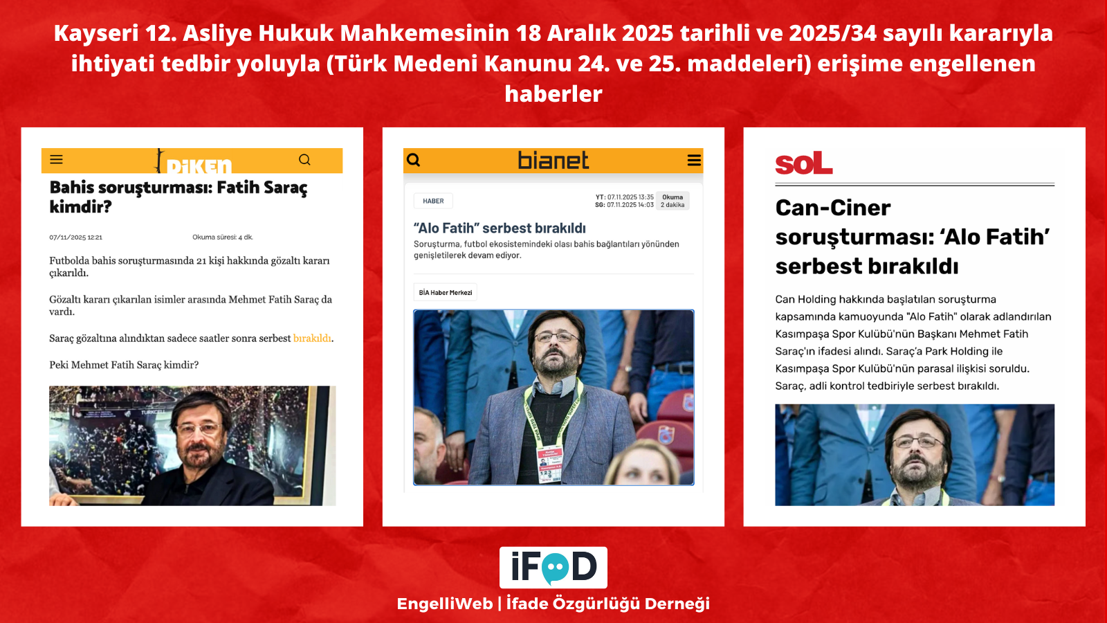 Can Holding ve bahis soruşturmaları kapsamında gözaltına alınan Mehmet Fatih Saraç hakkındaki haberler, Kayseri 12. Asliye Hukuk Mahkemesinin 18 Aralık 2025 tarihli ve 2025/34 sayılı kararıyla ihtiyati tedbir yoluyla (Türk Medeni Kanunu 24. ve 25. maddeleri) erişime engellendi.