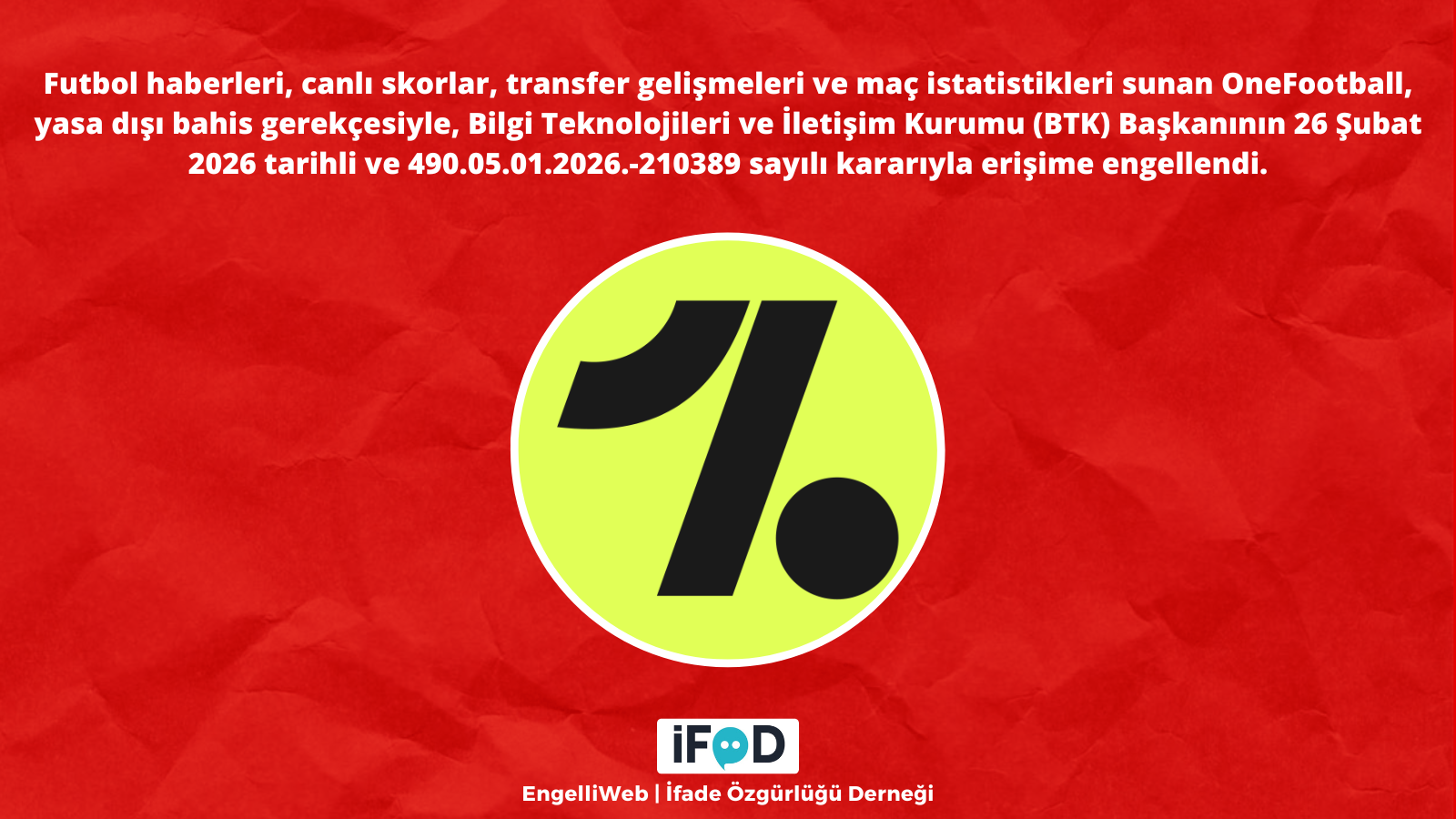 Futbol haberleri, canlı skorlar, transfer gelişmeleri ve maç istatistikleri sunan OneFootball, yasa dışı bahis gerekçesiyle, Bilgi Teknolojileri ve İletişim Kurumu (BTK) Başkanının 26 Şubat 2026 tarihli ve 490.05.01.2026.-210389 sayılı kararıyla erişime engellendi.