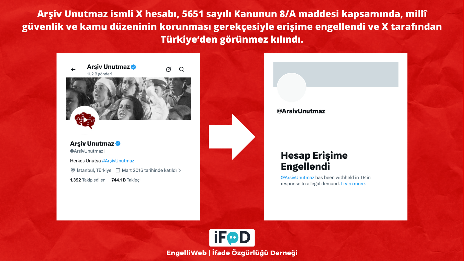 Geçmişteki açıklamaları hatırlatarak Türkiye’nin siyasi hafızasını canlı tutan Arşiv Unutmaz isimli X hesabına Nisan 2025’te erişime engellenmişti. X platformu, 744 bin takipçili hesabı Ocak 2026’da Türkiye’den görünmez kıldı.