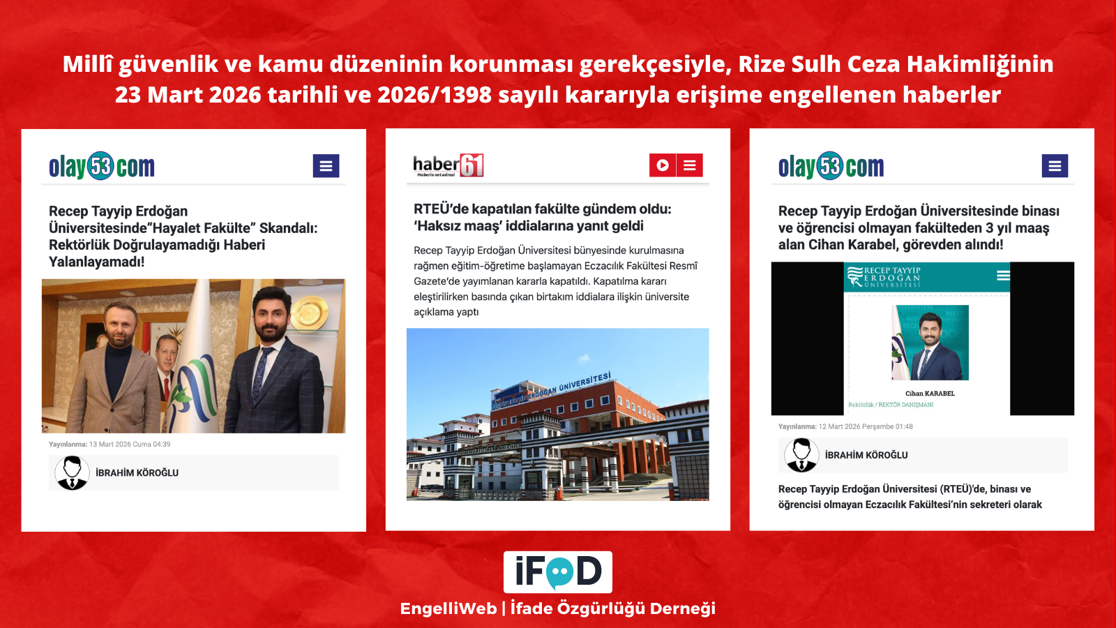 Recep Tayyip Erdoğan Üniversitesi’nde Eczacılık Fakültesi’nin hiç öğrenci almadan kapatılması ve binası ile öğrencisi bulunmayan fakülteye “fakülte sekreteri” olarak atanan Cihan Karabel’in yaklaşık 3 yıl boyunca maaş aldığı iddiasına ilişkin haberler, millî güvenlik ve kamu düzeninin korunması gerekçesiyle 16 Mart 2026’da erişime engellenmişti.