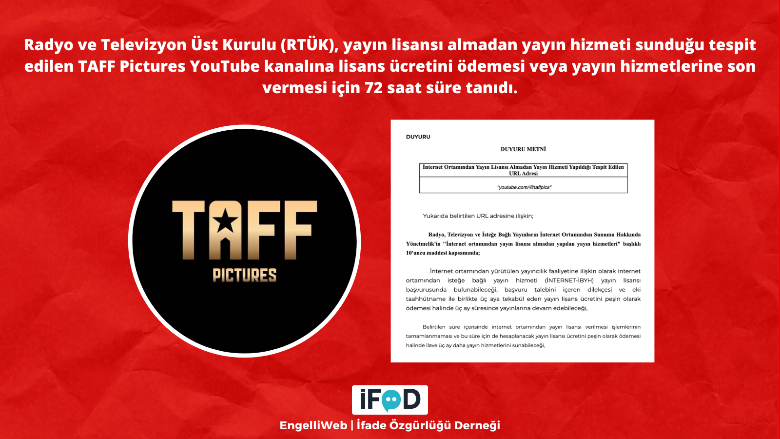 Radyo ve Televizyon Üst Kurulu (RTÜK), yayın lisansı almadan yayın hizmeti sunduğu tespit edilen 1,3M aboneli TAFF Pictures YouTube kanalına lisans ücretini ödemesi veya yayın hizmetlerine son vermesi için 72 saat süre tanıdı. İlgili duyuru 6 Kasım 2025’te, RTÜK’ün 3 Ekim 2025 tarihli ve 2025/39 sayılı toplantısında alınan karar gereği yayınlandı. 72 saat içerisinde gerekli lisans alımı gerçekleştirilmez ya da yayın hizmetine son verilmezse kanala erişim engellenecek.