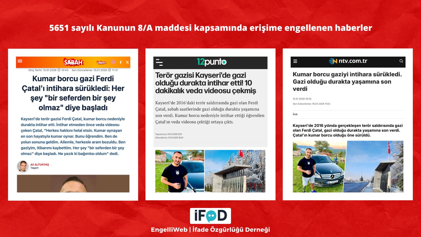Terör gazisi Ferdi Çatal’ın yaşamına son vermesiyle ilgili haberler ve sosyal medya paylaşımları, 5651 sayılı Kanunun 8/A maddesi kapsamında erişime engellendi.